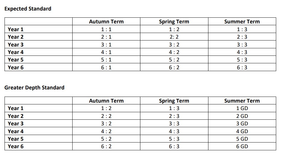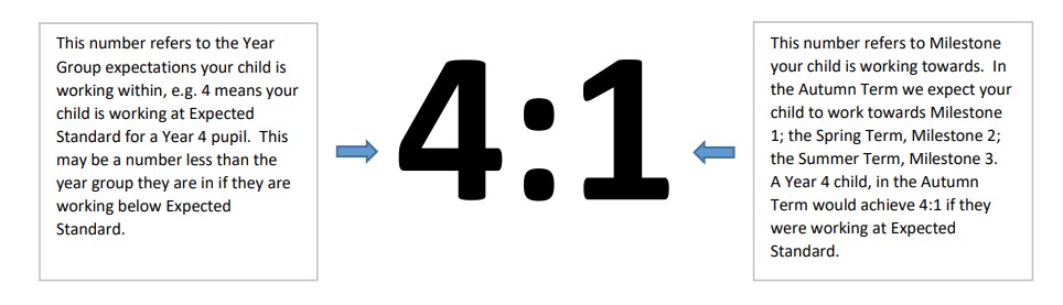 If your child is working towards Greater Depth Standard, the attainment level will indicate the Milestone for the next term, e.g. A child working towards Greater Depth Standard in the Autumn Term would be recorded as 4 : 2. In the Spring Term, they would be recorded as 4 : 3. At the end of the Summer Term, they would achieve 4GD. This confirms they have met the standards for Greater Depth at the end of Year 4. If your child is not working at Expected Standard, the attainment level will indicate the level they are working at. If a Year 4 pupil was recorded as 3 : 2, it indicates they are working at the standard we expect a Year 3 child to be at in the Spring Term.